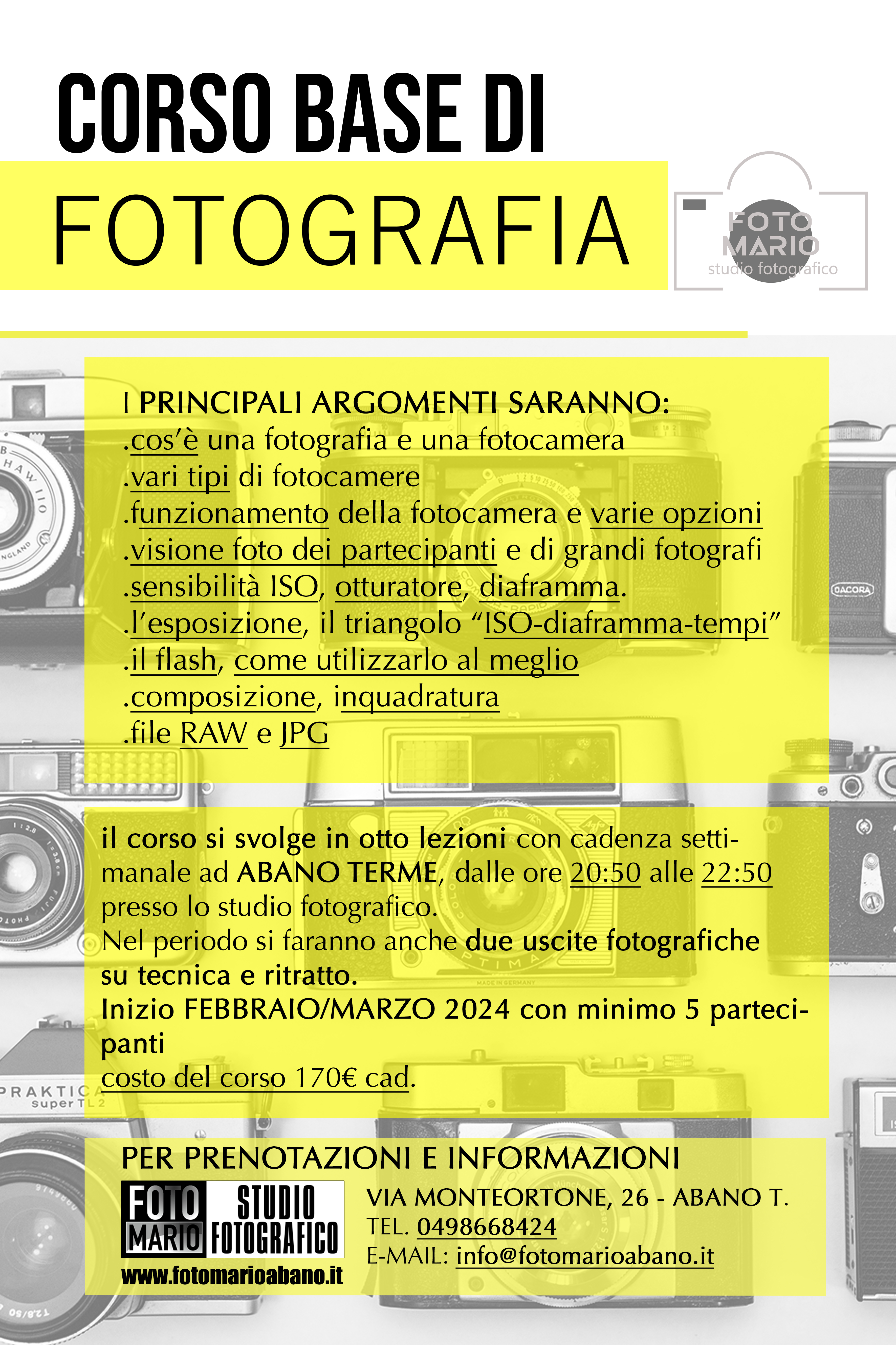 Corso di fotografia base Posted 19:28 by fotomarioabano & filed under Promozioni-News !. Il nuovo corso di fotografia base in programmazione per febbraio/marzo 2024 che si terrà ad Abano Terme (PD) Per chi fosse interessato mi contatti!! Entrate anche voi nel meraviglioso mondo della fotografia!!!!